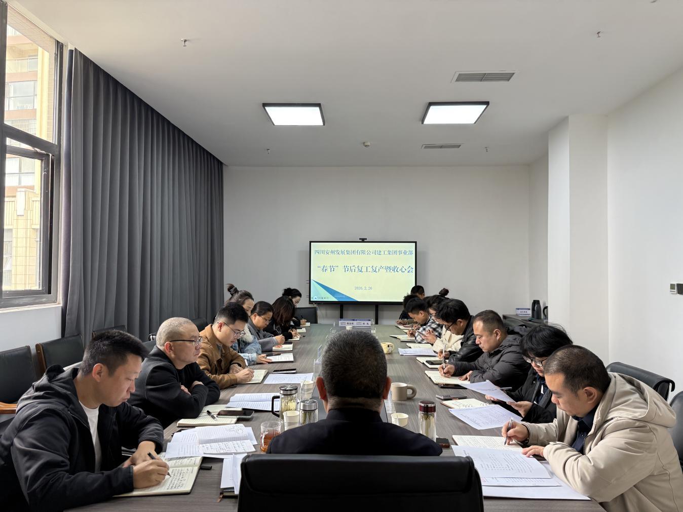 2月26日上午,建工集团事业部召开2026年春节节后复工复产暨收心会,动员全体干部员工迅速收心归位,以“开局即决战、起步即冲刺”的姿态,全力冲刺一季度“开门红”。集团党委委员、总工程师、事业部总经理汪丹主持会议并讲话,事业部全体管理人员参加。
