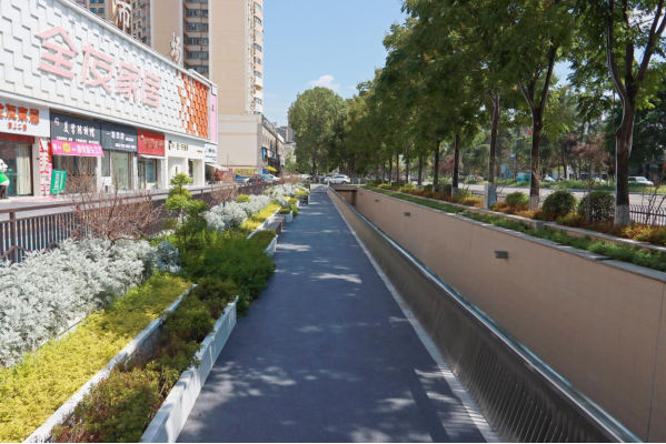 同步推进的3.3公里长的滨河北路海绵化工程项目,创新应用集成透水铺装、下沉式绿地和雨水溢流口等多种海绵措施,构建了完整的“渗-滞-蓄-净-用-排”雨水管理链条,将绵阳城市水系管网与既有公园调蓄空间有效衔接,推动片区平均径流控制率超72%,面源污染削减率超58%,有效减轻市政管网压力,推动水资源的可持续利用,真正让每一滴雨水都成为滋养城市的珍贵资源。